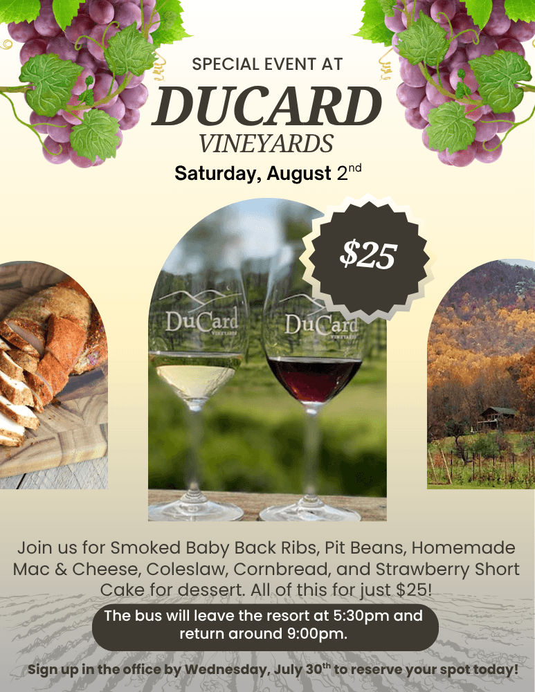 Join us for a relaxing evening at Ducard Vineyards. We will board the vans at 5:30pm and return around 9:00pm . When you arrive, you will tour the vineyard and then enjoy an amazing dinner paired with some of Virginia’s finest wines. On tonight’s menu: Smoked Baby Back Ribs, Pit Beans, Homemade Mac & Cheese, Coleslaw, Cornbread, and Strawberry Short Cake for dessert. All of this for just $25!